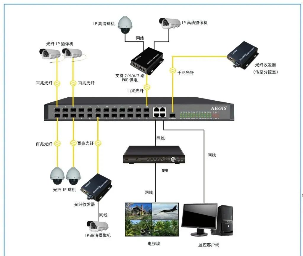 因為網線傳輸距離受限在100米范圍以內,所以當超過100米的范圍時,我們可以采購光纖作為傳輸介質,光纖不但可以遠距離傳輸,而且效果穩定,且光纖的價格比網線便宜。但是我們需要配上光纖收發器。