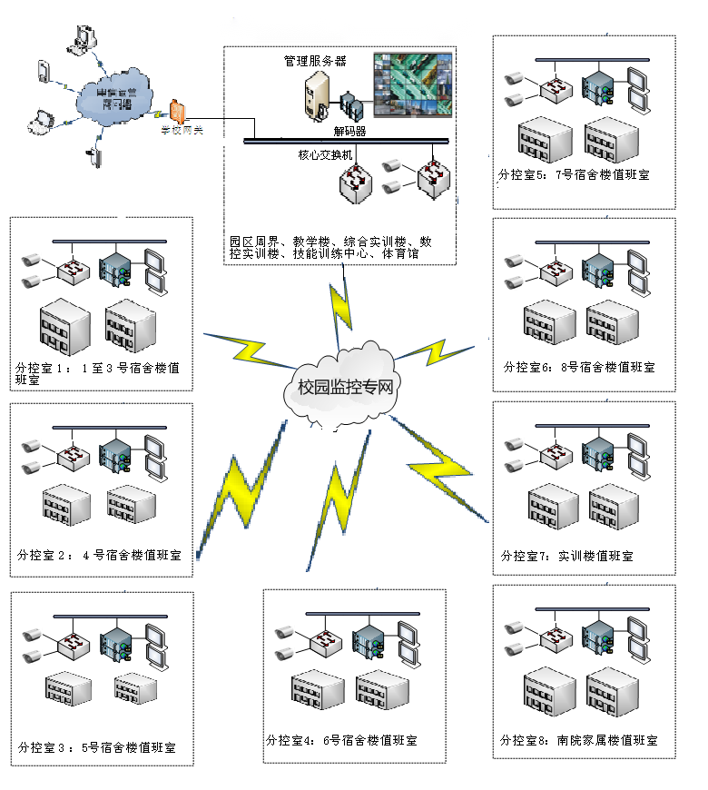 (5)值班室監(jiān)控建設(shè)在各教學(xué)樓、各宿舍樓、各行政管理單位的值班室內(nèi),主要設(shè)備有顯示設(shè)備和控制設(shè)備,可以對(duì)本分控管理范圍內(nèi)的設(shè)備進(jìn)行視頻瀏覽、設(shè)備控制等操作。